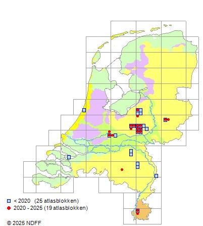 Het aantal atlasblokken (5x5 km) waarin de soort is gemeld binnen een periode van vijf jaar (vanaf 1980) of twintig jaar. Niet gecorrigeerd voor waarnemersinspanning en het aantal doorgegeven waarnemingen kan sterk variëren per periode, dus een trend in verspreiding kan hier niet direct uit worden afgelezen. Het opgegeven jaartal is het eerste jaar van de periode. Bron: gevalideerde waarnemingen uit de NDFF.