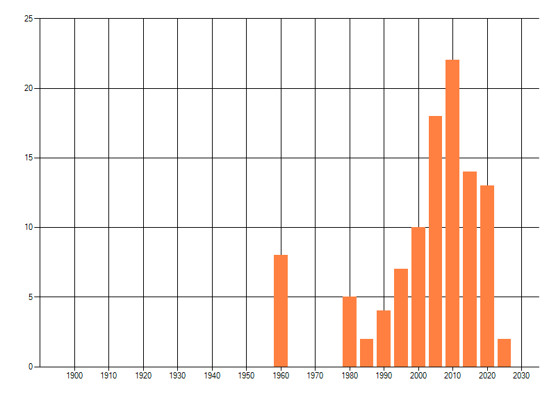 Het aantal atlasblokken (5x5 km) waarin de soort is gemeld binnen een periode van vijf jaar (vanaf 1980) of twintig jaar. Niet gecorrigeerd voor waarnemersinspanning en het aantal doorgegeven waarnemingen kan sterk variëren per periode, dus een trend in verspreiding kan hier niet direct uit worden afgelezen. Het opgegeven jaartal is het eerste jaar van de periode. Bron: gevalideerde waarnemingen uit de NDFF.