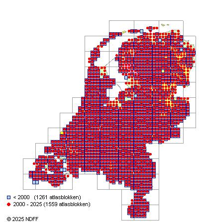 Het aantal atlasblokken (5x5 km) waarin de soort is gemeld binnen een periode van vijf jaar (vanaf 1980) of twintig jaar. Niet gecorrigeerd voor waarnemersinspanning en het aantal doorgegeven waarnemingen kan sterk variëren per periode, dus een trend in verspreiding kan hier niet direct uit worden afgelezen. Het opgegeven jaartal is het eerste jaar van de periode. Bron: gevalideerde waarnemingen uit de NDFF.