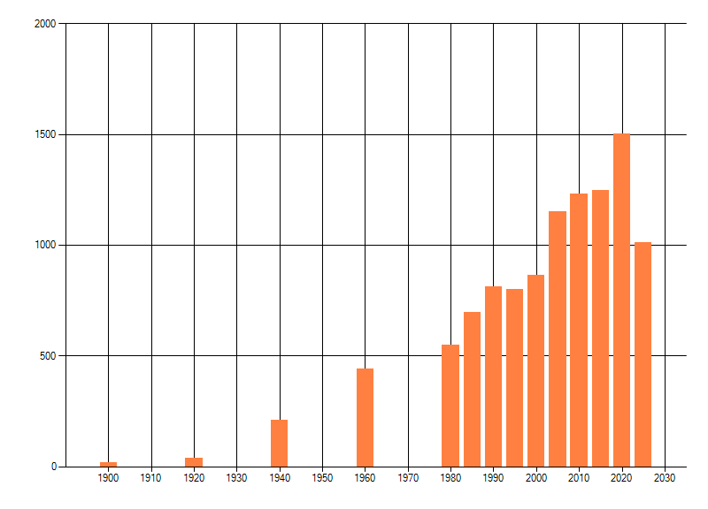 Het aantal atlasblokken (5x5 km) waarin de soort is gemeld binnen een periode van vijf jaar (vanaf 1980) of twintig jaar. Niet gecorrigeerd voor waarnemersinspanning en het aantal doorgegeven waarnemingen kan sterk variëren per periode, dus een trend in verspreiding kan hier niet direct uit worden afgelezen. Het opgegeven jaartal is het eerste jaar van de periode. Bron: gevalideerde waarnemingen uit de NDFF.