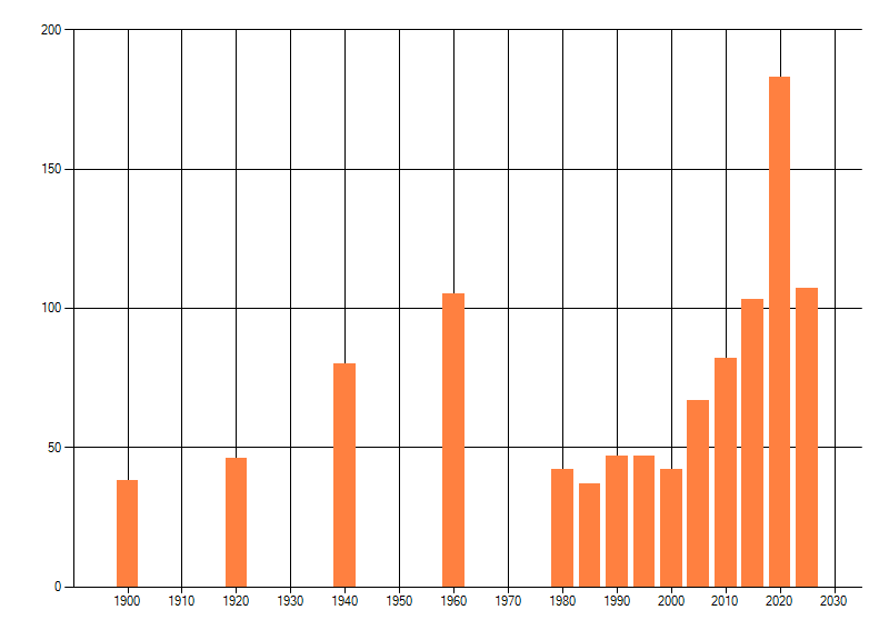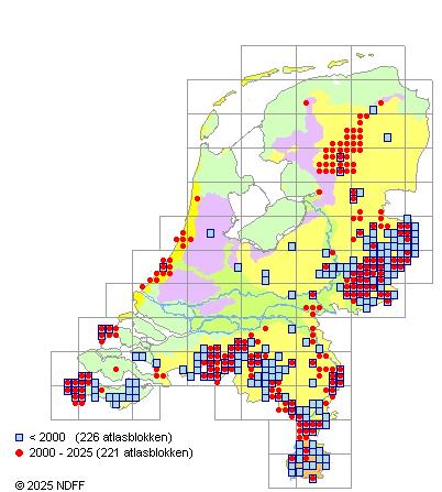 Het aantal atlasblokken (5x5 km) waarin de soort is gemeld binnen een periode van vijf jaar (vanaf 1980) of twintig jaar. Niet gecorrigeerd voor waarnemersinspanning en het aantal doorgegeven waarnemingen kan sterk variëren per periode, dus een trend in verspreiding kan hier niet direct uit worden afgelezen. Het opgegeven jaartal is het eerste jaar van de periode. Bron: gevalideerde waarnemingen uit de NDFF.