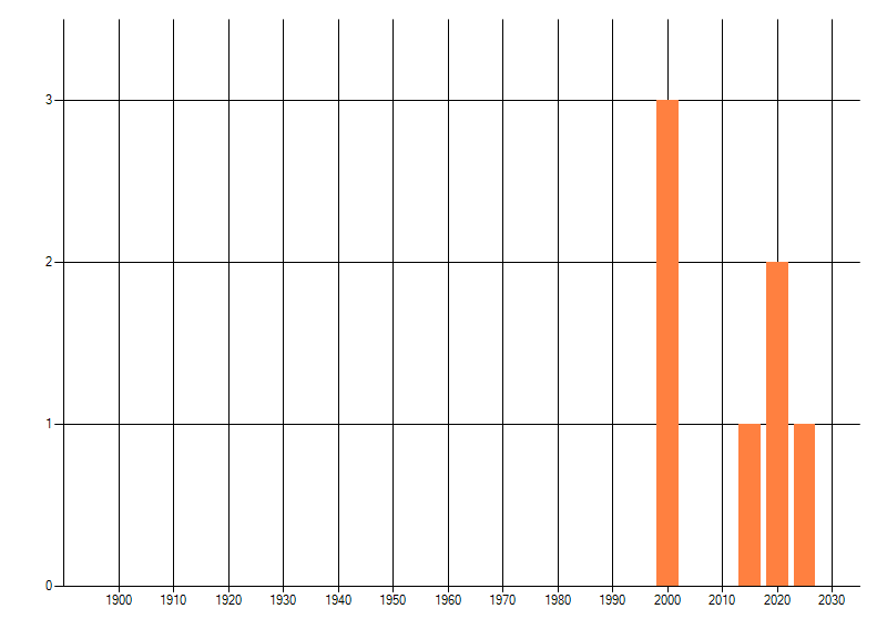Het aantal atlasblokken (5x5 km) waarin de soort is gemeld binnen een periode van vijf jaar (vanaf 1980) of twintig jaar. Niet gecorrigeerd voor waarnemersinspanning en het aantal doorgegeven waarnemingen kan sterk variëren per periode, dus een trend in verspreiding kan hier niet direct uit worden afgelezen. Het opgegeven jaartal is het eerste jaar van de periode. Bron: gevalideerde waarnemingen uit de NDFF.