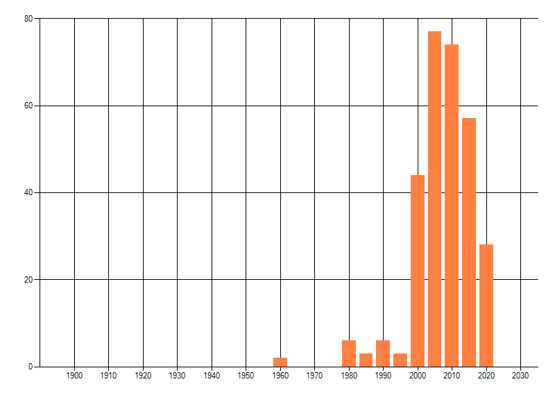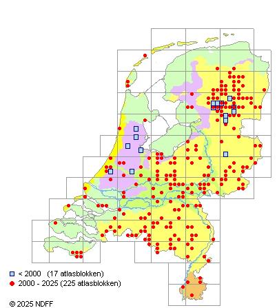 Het aantal atlasblokken (5x5 km) waarin de soort is gemeld binnen een periode van vijf jaar (vanaf 1980) of twintig jaar. Niet gecorrigeerd voor waarnemersinspanning en het aantal doorgegeven waarnemingen kan sterk variëren per periode, dus een trend in verspreiding kan hier niet direct uit worden afgelezen. Het opgegeven jaartal is het eerste jaar van de periode. Bron: gevalideerde waarnemingen uit de NDFF.