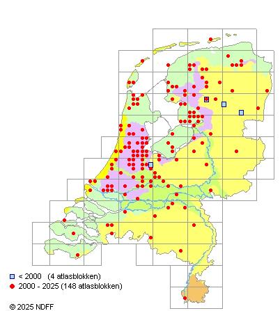 Het aantal atlasblokken (5x5 km) waarin de soort is gemeld binnen een periode van vijf jaar (vanaf 1980) of twintig jaar. Niet gecorrigeerd voor waarnemersinspanning en het aantal doorgegeven waarnemingen kan sterk variëren per periode, dus een trend in verspreiding kan hier niet direct uit worden afgelezen. Het opgegeven jaartal is het eerste jaar van de periode. Bron: gevalideerde waarnemingen uit de NDFF.