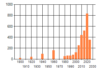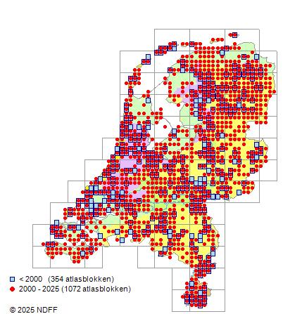 Het aantal atlasblokken (5x5 km) waarin de soort is gemeld binnen een periode van vijf jaar (vanaf 1980) of twintig jaar. Niet gecorrigeerd voor waarnemersinspanning en het aantal doorgegeven waarnemingen kan sterk variëren per periode, dus een trend in verspreiding kan hier niet direct uit worden afgelezen. Het opgegeven jaartal is het eerste jaar van de periode. Bron: gevalideerde waarnemingen uit de NDFF.