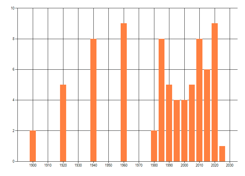 Het aantal atlasblokken (5x5 km) waarin de soort is gemeld binnen een periode van vijf jaar (vanaf 1980) of twintig jaar. Niet gecorrigeerd voor waarnemersinspanning en het aantal doorgegeven waarnemingen kan sterk variëren per periode, dus een trend in verspreiding kan hier niet direct uit worden afgelezen. Het opgegeven jaartal is het eerste jaar van de periode. Bron: gevalideerde waarnemingen uit de NDFF.