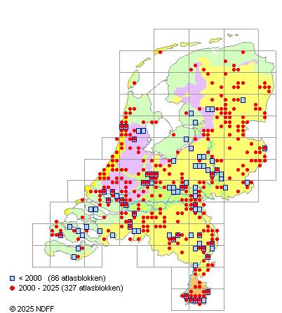 Het aantal atlasblokken (5x5 km) waarin de soort is gemeld binnen een periode van vijf jaar (vanaf 1980) of twintig jaar. Niet gecorrigeerd voor waarnemersinspanning en het aantal doorgegeven waarnemingen kan sterk variëren per periode, dus een trend in verspreiding kan hier niet direct uit worden afgelezen. Het opgegeven jaartal is het eerste jaar van de periode. Bron: gevalideerde waarnemingen uit de NDFF.