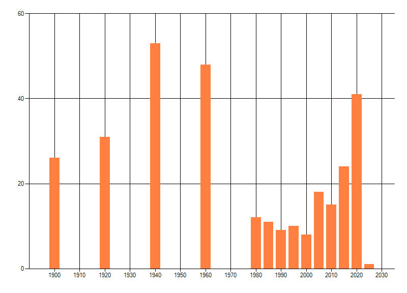 Het aantal atlasblokken (5x5 km) waarin de soort is gemeld binnen een periode van vijf jaar (vanaf 1980) of twintig jaar. Niet gecorrigeerd voor waarnemersinspanning en het aantal doorgegeven waarnemingen kan sterk variëren per periode, dus een trend in verspreiding kan hier niet direct uit worden afgelezen. Het opgegeven jaartal is het eerste jaar van de periode. Bron: gevalideerde waarnemingen uit de NDFF.