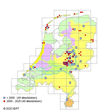 Het aantal atlasblokken (5x5 km) waarin de soort is gemeld binnen een periode van vijf jaar (vanaf 1980) of twintig jaar. Niet gecorrigeerd voor waarnemersinspanning en het aantal doorgegeven waarnemingen kan sterk variëren per periode, dus een trend in verspreiding kan hier niet direct uit worden afgelezen. Het opgegeven jaartal is het eerste jaar van de periode. Bron: gevalideerde waarnemingen uit de NDFF.
