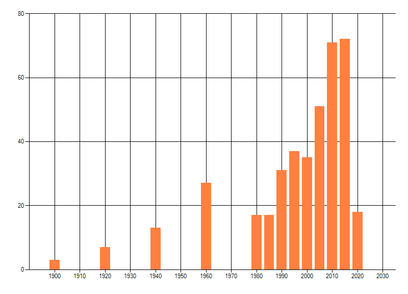Het aantal atlasblokken (5x5 km) waarin de soort is gemeld binnen een periode van vijf jaar (vanaf 1980) of twintig jaar. Niet gecorrigeerd voor waarnemersinspanning en het aantal doorgegeven waarnemingen kan sterk variëren per periode, dus een trend in verspreiding kan hier niet direct uit worden afgelezen. Het opgegeven jaartal is het eerste jaar van de periode. Bron: gevalideerde waarnemingen uit de NDFF.