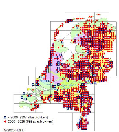 Het aantal atlasblokken (5x5 km) waarin de soort is gemeld binnen een periode van vijf jaar (vanaf 1980) of twintig jaar. Niet gecorrigeerd voor waarnemersinspanning en het aantal doorgegeven waarnemingen kan sterk variëren per periode, dus een trend in verspreiding kan hier niet direct uit worden afgelezen. Het opgegeven jaartal is het eerste jaar van de periode. Bron: gevalideerde waarnemingen uit de NDFF.