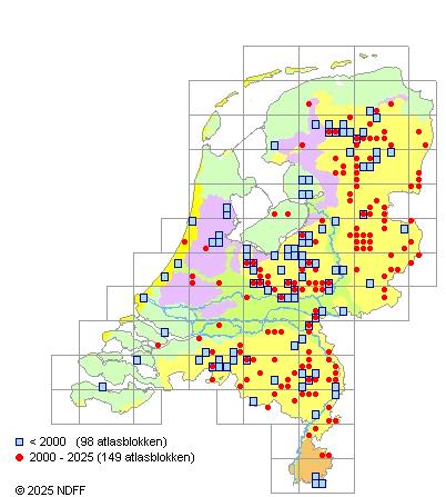 Het aantal atlasblokken (5x5 km) waarin de soort is gemeld binnen een periode van vijf jaar (vanaf 1980) of twintig jaar. Niet gecorrigeerd voor waarnemersinspanning en het aantal doorgegeven waarnemingen kan sterk variëren per periode, dus een trend in verspreiding kan hier niet direct uit worden afgelezen. Het opgegeven jaartal is het eerste jaar van de periode. Bron: gevalideerde waarnemingen uit de NDFF.