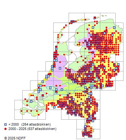 Het aantal atlasblokken (5x5 km) waarin de soort is gemeld binnen een periode van vijf jaar (vanaf 1980) of twintig jaar. Niet gecorrigeerd voor waarnemersinspanning en het aantal doorgegeven waarnemingen kan sterk variëren per periode, dus een trend in verspreiding kan hier niet direct uit worden afgelezen. Het opgegeven jaartal is het eerste jaar van de periode. Bron: gevalideerde waarnemingen uit de NDFF.