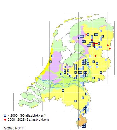 Zeldzaam. Komt lokaal voor in de noordelijke en oostelijke helft van het land. RL: ernstig bedreigd.