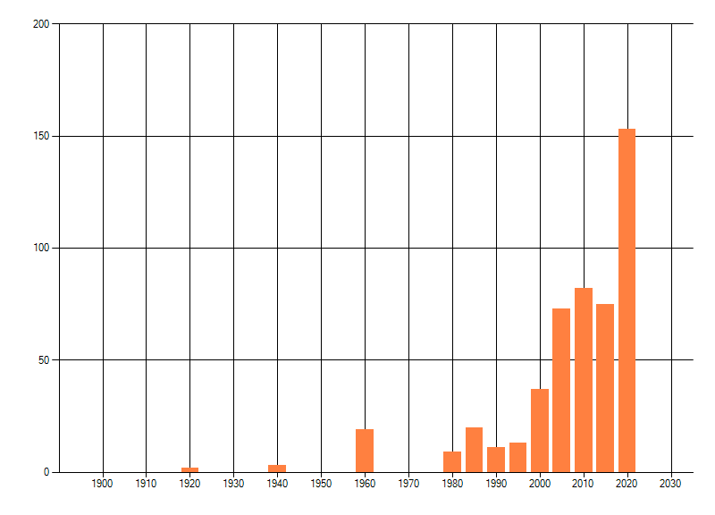 Het aantal atlasblokken (5x5 km) waarin de soort is gemeld binnen een periode van vijf jaar (vanaf 1980) of twintig jaar. Niet gecorrigeerd voor waarnemersinspanning en het aantal doorgegeven waarnemingen kan sterk variëren per periode, dus een trend in verspreiding kan hier niet direct uit worden afgelezen. Het opgegeven jaartal is het eerste jaar van de periode. Bron: gevalideerde waarnemingen uit de NDFF.