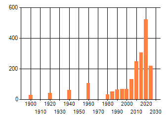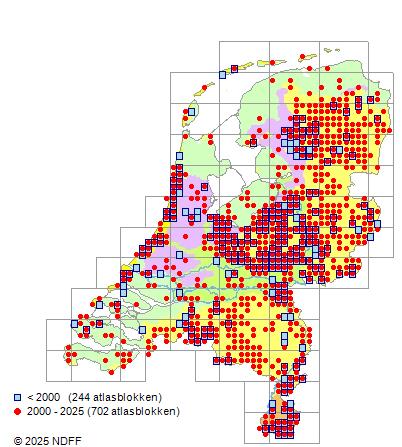 Het aantal atlasblokken (5x5 km) waarin de soort is gemeld binnen een periode van vijf jaar (vanaf 1980) of twintig jaar. Niet gecorrigeerd voor waarnemersinspanning en het aantal doorgegeven waarnemingen kan sterk variëren per periode, dus een trend in verspreiding kan hier niet direct uit worden afgelezen. Het opgegeven jaartal is het eerste jaar van de periode. Bron: gevalideerde waarnemingen uit de NDFF.