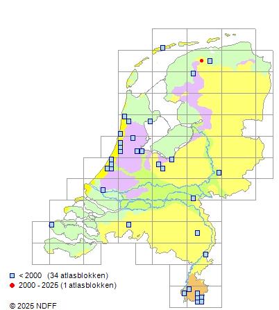 Het aantal atlasblokken (5x5 km) waarin de soort is gemeld binnen een periode van vijf jaar (vanaf 1980) of twintig jaar. Niet gecorrigeerd voor waarnemersinspanning en het aantal doorgegeven waarnemingen kan sterk variëren per periode, dus een trend in verspreiding kan hier niet direct uit worden afgelezen. Het opgegeven jaartal is het eerste jaar van de periode. Bron: gevalideerde waarnemingen uit de NDFF.
