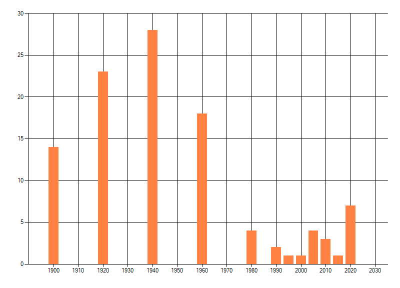 Het aantal atlasblokken (5x5 km) waarin de soort is gemeld binnen een periode van vijf jaar (vanaf 1980) of twintig jaar. Niet gecorrigeerd voor waarnemersinspanning en het aantal doorgegeven waarnemingen kan sterk variëren per periode, dus een trend in verspreiding kan hier niet direct uit worden afgelezen. Het opgegeven jaartal is het eerste jaar van de periode. Bron: gevalideerde waarnemingen uit de NDFF.
