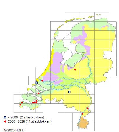 Het aantal atlasblokken (5x5 km) waarin de soort is gemeld binnen een periode van vijf jaar (vanaf 1980) of twintig jaar. Niet gecorrigeerd voor waarnemersinspanning en het aantal doorgegeven waarnemingen kan sterk variëren per periode, dus een trend in verspreiding kan hier niet direct uit worden afgelezen. Het opgegeven jaartal is het eerste jaar van de periode. Bron: gevalideerde waarnemingen uit de NDFF.