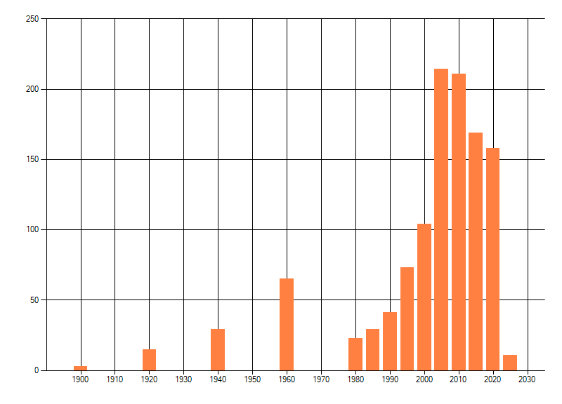 Het aantal atlasblokken (5x5 km) waarin de soort is gemeld binnen een periode van vijf jaar (vanaf 1980) of twintig jaar. Niet gecorrigeerd voor waarnemersinspanning en het aantal doorgegeven waarnemingen kan sterk variëren per periode, dus een trend in verspreiding kan hier niet direct uit worden afgelezen. Het opgegeven jaartal is het eerste jaar van de periode. Bron: gevalideerde waarnemingen uit de NDFF.