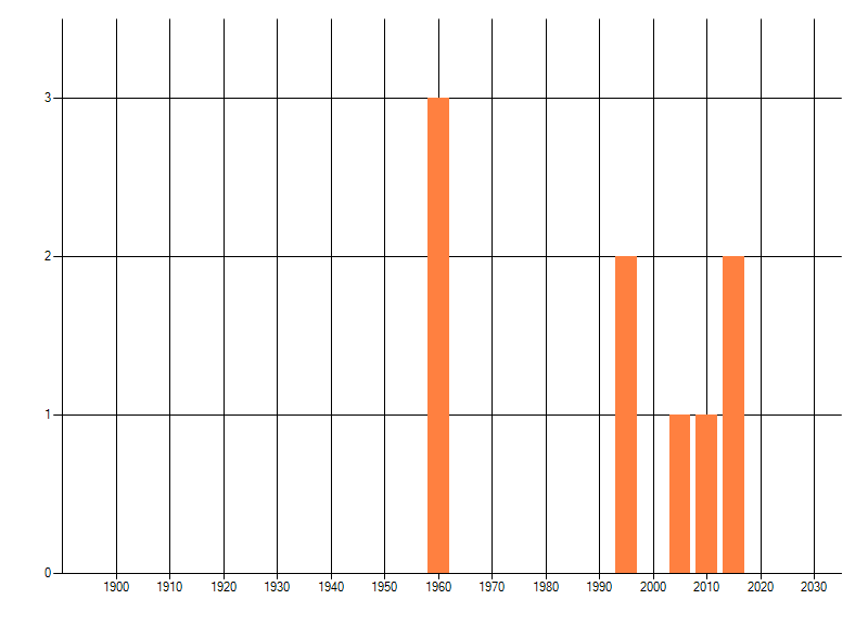 Het aantal atlasblokken (5x5 km) waarin de soort is gemeld binnen een periode van vijf jaar (vanaf 1980) of twintig jaar. Niet gecorrigeerd voor waarnemersinspanning en het aantal doorgegeven waarnemingen kan sterk variëren per periode, dus een trend in verspreiding kan hier niet direct uit worden afgelezen. Het opgegeven jaartal is het eerste jaar van de periode. Bron: gevalideerde waarnemingen uit de NDFF.