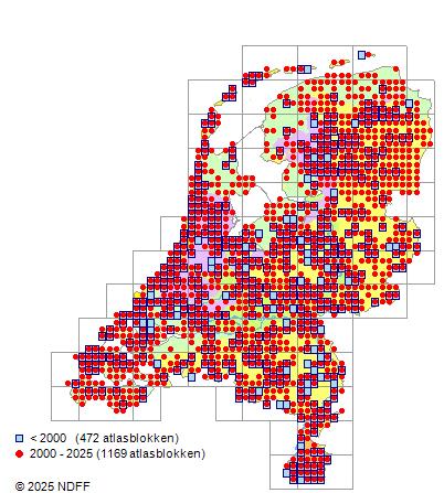 Het aantal atlasblokken (5x5 km) waarin de soort is gemeld binnen een periode van vijf jaar (vanaf 1980) of twintig jaar. Niet gecorrigeerd voor waarnemersinspanning en het aantal doorgegeven waarnemingen kan sterk variëren per periode, dus een trend in verspreiding kan hier niet direct uit worden afgelezen. Het opgegeven jaartal is het eerste jaar van de periode. Bron: gevalideerde waarnemingen uit de NDFF.