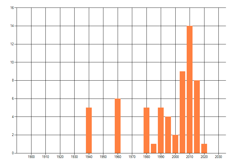 Het aantal atlasblokken (5x5 km) waarin de soort is gemeld binnen een periode van vijf jaar (vanaf 1980) of twintig jaar. Niet gecorrigeerd voor waarnemersinspanning en het aantal doorgegeven waarnemingen kan sterk variëren per periode, dus een trend in verspreiding kan hier niet direct uit worden afgelezen. Het opgegeven jaartal is het eerste jaar van de periode. Bron: gevalideerde waarnemingen uit de NDFF.