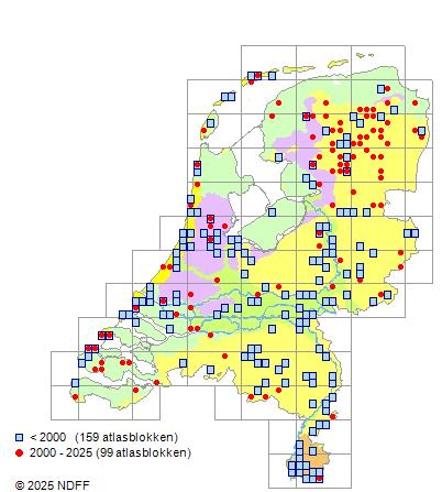 Het aantal atlasblokken (5x5 km) waarin de soort is gemeld binnen een periode van vijf jaar (vanaf 1980) of twintig jaar. Niet gecorrigeerd voor waarnemersinspanning en het aantal doorgegeven waarnemingen kan sterk variëren per periode, dus een trend in verspreiding kan hier niet direct uit worden afgelezen. Het opgegeven jaartal is het eerste jaar van de periode. Bron: gevalideerde waarnemingen uit de NDFF.