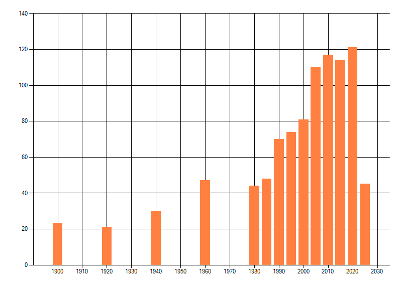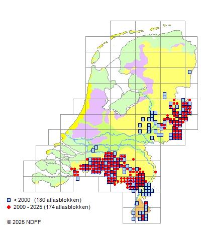 Het aantal atlasblokken (5x5 km) waarin de soort is gemeld binnen een periode van vijf jaar (vanaf 1980) of twintig jaar. Niet gecorrigeerd voor waarnemersinspanning en het aantal doorgegeven waarnemingen kan sterk variëren per periode, dus een trend in verspreiding kan hier niet direct uit worden afgelezen. Het opgegeven jaartal is het eerste jaar van de periode. Bron: gevalideerde waarnemingen uit de NDFF.