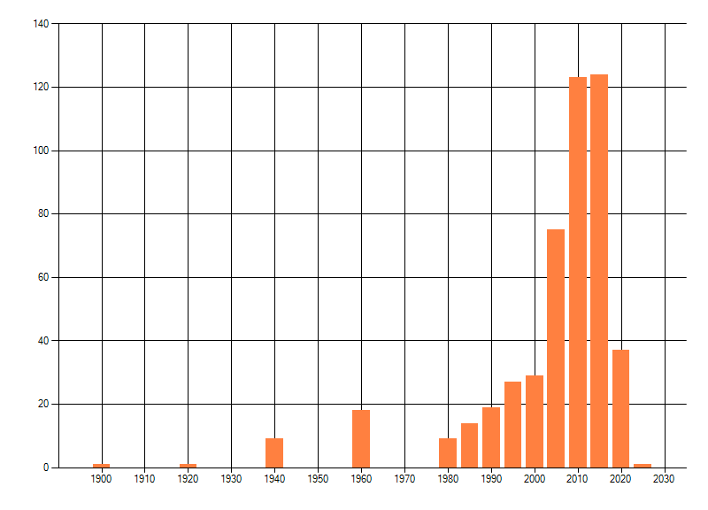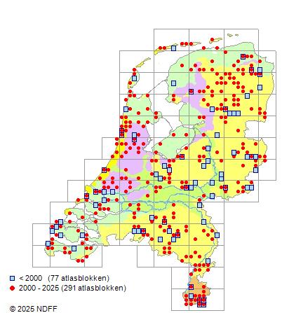 Het aantal atlasblokken (5x5 km) waarin de soort is gemeld binnen een periode van vijf jaar (vanaf 1980) of twintig jaar. Niet gecorrigeerd voor waarnemersinspanning en het aantal doorgegeven waarnemingen kan sterk variëren per periode, dus een trend in verspreiding kan hier niet direct uit worden afgelezen. Het opgegeven jaartal is het eerste jaar van de periode. Bron: gevalideerde waarnemingen uit de NDFF.