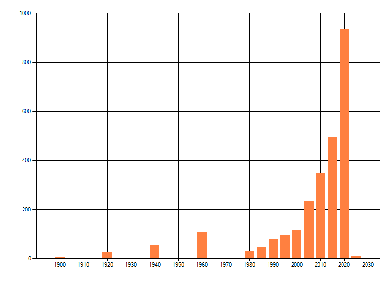 Het aantal atlasblokken (5x5 km) waarin de soort is gemeld binnen een periode van vijf jaar (vanaf 1980) of twintig jaar. Niet gecorrigeerd voor waarnemersinspanning en het aantal doorgegeven waarnemingen kan sterk variëren per periode, dus een trend in verspreiding kan hier niet direct uit worden afgelezen. Het opgegeven jaartal is het eerste jaar van de periode. Bron: gevalideerde waarnemingen uit de NDFF.