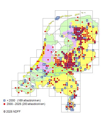 Het aantal atlasblokken (5x5 km) waarin de soort is gemeld binnen een periode van vijf jaar (vanaf 1980) of twintig jaar. Niet gecorrigeerd voor waarnemersinspanning en het aantal doorgegeven waarnemingen kan sterk variëren per periode, dus een trend in verspreiding kan hier niet direct uit worden afgelezen. Het opgegeven jaartal is het eerste jaar van de periode. Bron: gevalideerde waarnemingen uit de NDFF.