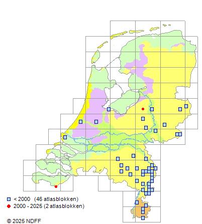 Zeer zeldzaam. Een soort die vroeger lokaal voorkwam in het zuidoosten van het land; de meest recente waarnemingen komen uit Zeeland (2008) en Drenthe (2010, 2014). RL: gevoelig.