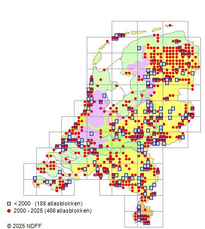 Het aantal atlasblokken (5x5 km) waarin de soort is gemeld binnen een periode van vijf jaar (vanaf 1980) of twintig jaar. Niet gecorrigeerd voor waarnemersinspanning en het aantal doorgegeven waarnemingen kan sterk variëren per periode, dus een trend in verspreiding kan hier niet direct uit worden afgelezen. Het opgegeven jaartal is het eerste jaar van de periode. Bron: gevalideerde waarnemingen uit de NDFF.