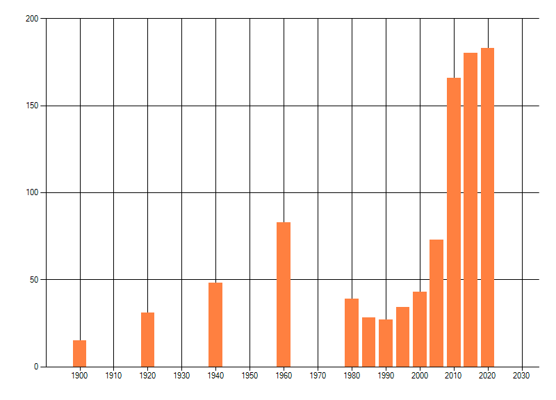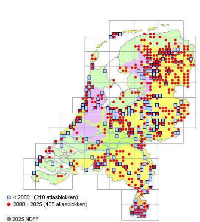 Het aantal atlasblokken (5x5 km) waarin de soort is gemeld binnen een periode van vijf jaar (vanaf 1980) of twintig jaar. Niet gecorrigeerd voor waarnemersinspanning en het aantal doorgegeven waarnemingen kan sterk variëren per periode, dus een trend in verspreiding kan hier niet direct uit worden afgelezen. Het opgegeven jaartal is het eerste jaar van de periode. Bron: gevalideerde waarnemingen uit de NDFF.