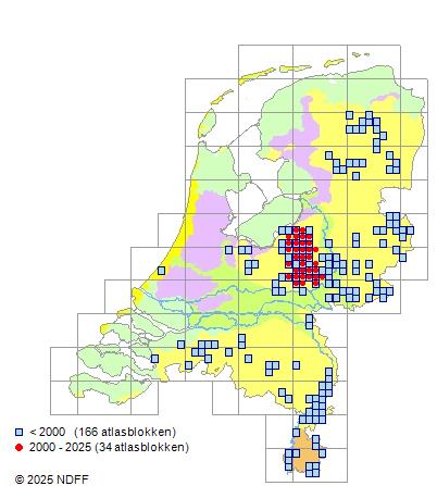 Het aantal atlasblokken (5x5 km) waarin de soort is gemeld binnen een periode van vijf jaar (vanaf 1980) of twintig jaar. Niet gecorrigeerd voor waarnemersinspanning en het aantal doorgegeven waarnemingen kan sterk variëren per periode, dus een trend in verspreiding kan hier niet direct uit worden afgelezen. Het opgegeven jaartal is het eerste jaar van de periode. Bron: gevalideerde waarnemingen uit de NDFF.