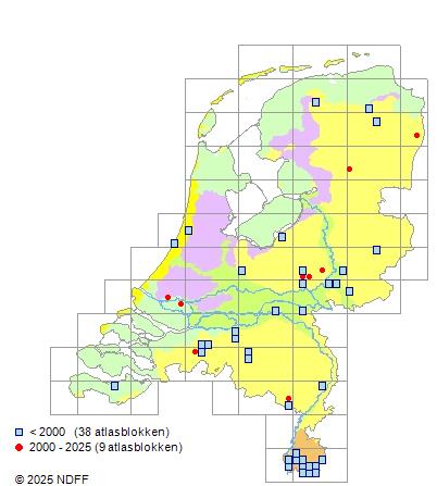 Het aantal atlasblokken (5x5 km) waarin de soort is gemeld binnen een periode van vijf jaar (vanaf 1980) of twintig jaar. Niet gecorrigeerd voor waarnemersinspanning en het aantal doorgegeven waarnemingen kan sterk variëren per periode, dus een trend in verspreiding kan hier niet direct uit worden afgelezen. Het opgegeven jaartal is het eerste jaar van de periode. Bron: gevalideerde waarnemingen uit de NDFF.