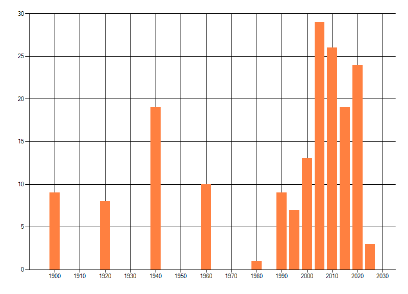 Het aantal atlasblokken (5x5 km) waarin de soort is gemeld binnen een periode van vijf jaar (vanaf 1980) of twintig jaar. Niet gecorrigeerd voor waarnemersinspanning en het aantal doorgegeven waarnemingen kan sterk variëren per periode, dus een trend in verspreiding kan hier niet direct uit worden afgelezen. Het opgegeven jaartal is het eerste jaar van de periode. Bron: gevalideerde waarnemingen uit de NDFF.
