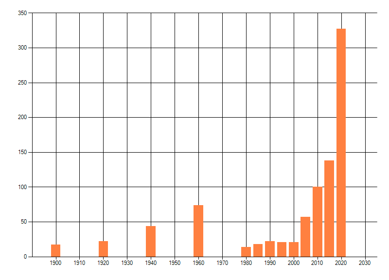 Het aantal atlasblokken (5x5 km) waarin de soort is gemeld binnen een periode van vijf jaar (vanaf 1980) of twintig jaar. Niet gecorrigeerd voor waarnemersinspanning en het aantal doorgegeven waarnemingen kan sterk variëren per periode, dus een trend in verspreiding kan hier niet direct uit worden afgelezen. Het opgegeven jaartal is het eerste jaar van de periode. Bron: gevalideerde waarnemingen uit de NDFF.