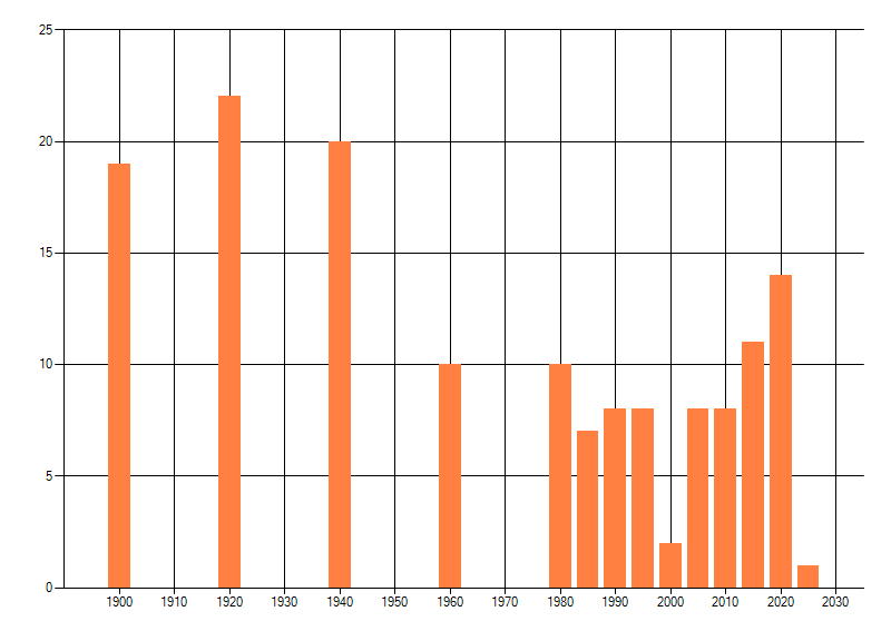 Het aantal atlasblokken (5x5 km) waarin de soort is gemeld binnen een periode van vijf jaar (vanaf 1980) of twintig jaar. Niet gecorrigeerd voor waarnemersinspanning en het aantal doorgegeven waarnemingen kan sterk variëren per periode, dus een trend in verspreiding kan hier niet direct uit worden afgelezen. Het opgegeven jaartal is het eerste jaar van de periode. Bron: gevalideerde waarnemingen uit de NDFF.