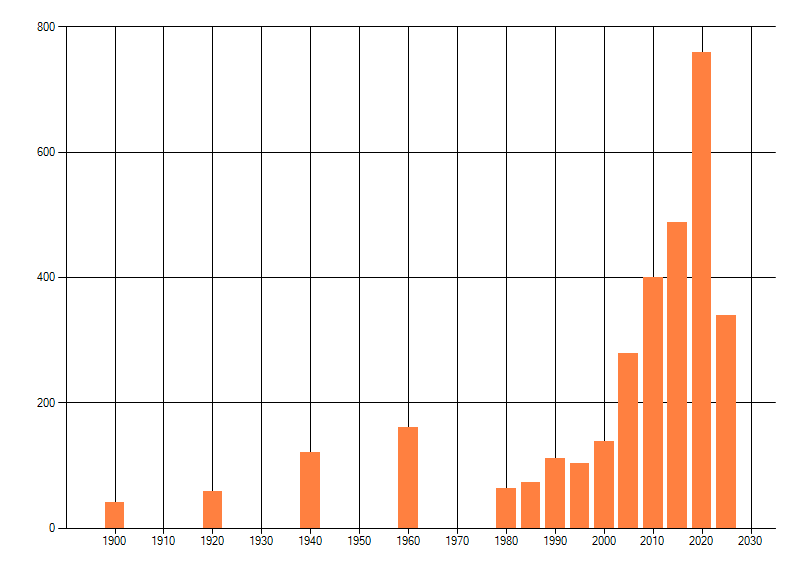 Het aantal atlasblokken (5x5 km) waarin de soort is gemeld binnen een periode van vijf jaar (vanaf 1980) of twintig jaar. Niet gecorrigeerd voor waarnemersinspanning en het aantal doorgegeven waarnemingen kan sterk variëren per periode, dus een trend in verspreiding kan hier niet direct uit worden afgelezen. Het opgegeven jaartal is het eerste jaar van de periode. Bron: gevalideerde waarnemingen uit de NDFF.