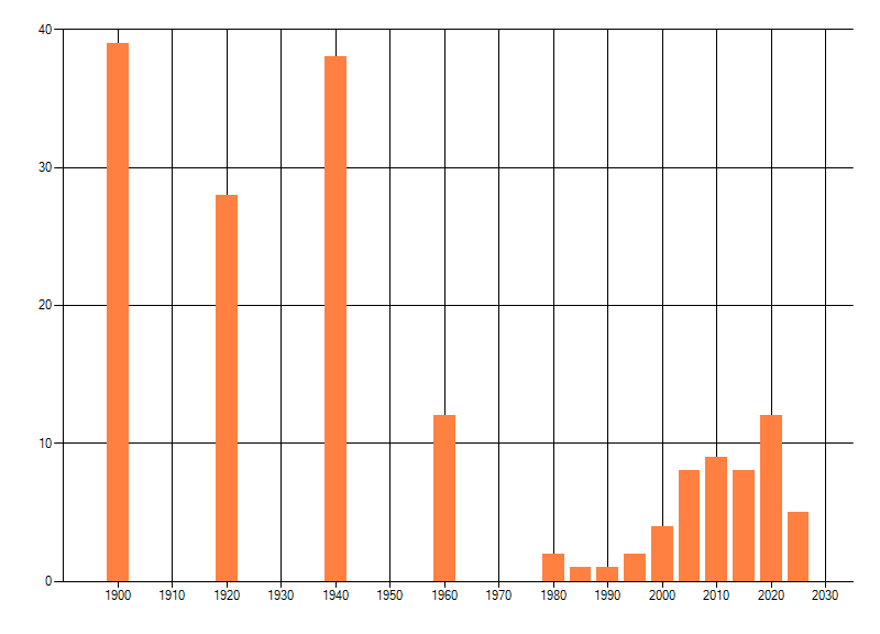 Het aantal atlasblokken (5x5 km) waarin de soort is gemeld binnen een periode van vijf jaar (vanaf 1980) of twintig jaar. Niet gecorrigeerd voor waarnemersinspanning en het aantal doorgegeven waarnemingen kan sterk variëren per periode, dus een trend in verspreiding kan hier niet direct uit worden afgelezen. Het opgegeven jaartal is het eerste jaar van de periode. Bron: gevalideerde waarnemingen uit de NDFF.