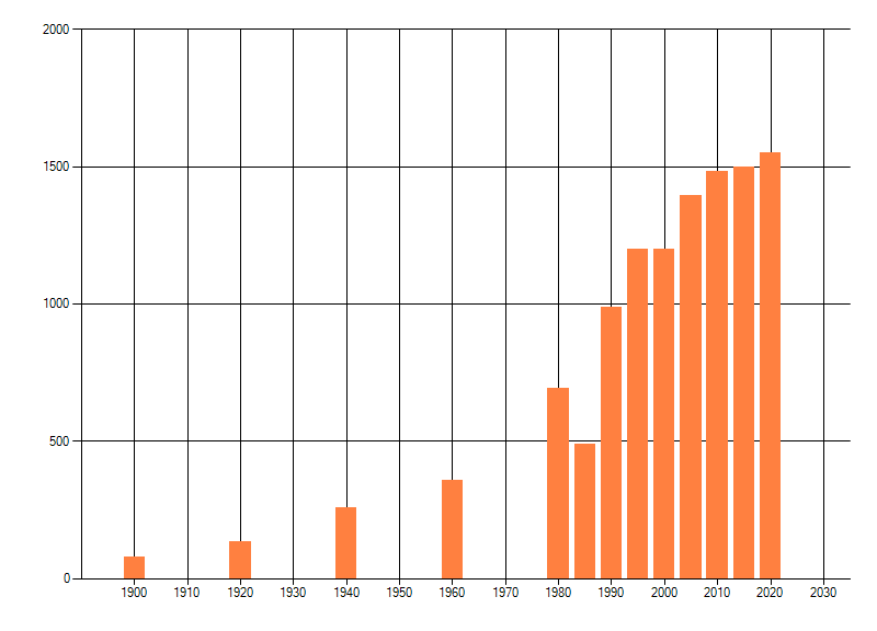 Het aantal atlasblokken (5x5 km) waarin de soort is gemeld binnen een periode van vijf jaar (vanaf 1980) of twintig jaar. Niet gecorrigeerd voor waarnemersinspanning en het aantal doorgegeven waarnemingen kan sterk variëren per periode, dus een trend in verspreiding kan hier niet direct uit worden afgelezen. Het opgegeven jaartal is het eerste jaar van de periode. Bron: gevalideerde waarnemingen uit de NDFF.