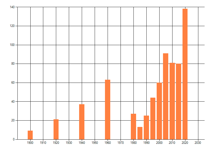Het aantal atlasblokken (5x5 km) waarin de soort is gemeld binnen een periode van vijf jaar (vanaf 1980) of twintig jaar. Niet gecorrigeerd voor waarnemersinspanning en het aantal doorgegeven waarnemingen kan sterk variëren per periode, dus een trend in verspreiding kan hier niet direct uit worden afgelezen. Het opgegeven jaartal is het eerste jaar van de periode. Bron: gevalideerde waarnemingen uit de NDFF.