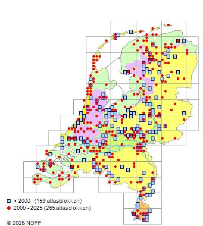 Het aantal atlasblokken (5x5 km) waarin de soort is gemeld binnen een periode van vijf jaar (vanaf 1980) of twintig jaar. Niet gecorrigeerd voor waarnemersinspanning en het aantal doorgegeven waarnemingen kan sterk variëren per periode, dus een trend in verspreiding kan hier niet direct uit worden afgelezen. Het opgegeven jaartal is het eerste jaar van de periode. Bron: gevalideerde waarnemingen uit de NDFF.