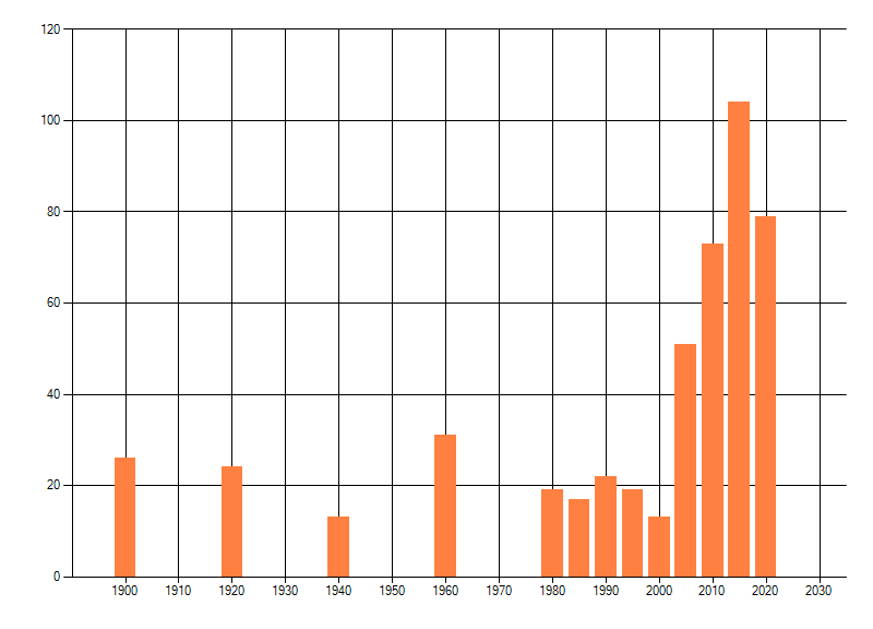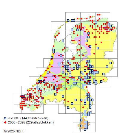Het aantal atlasblokken (5x5 km) waarin de soort is gemeld binnen een periode van vijf jaar (vanaf 1980) of twintig jaar. Niet gecorrigeerd voor waarnemersinspanning en het aantal doorgegeven waarnemingen kan sterk variëren per periode, dus een trend in verspreiding kan hier niet direct uit worden afgelezen. Het opgegeven jaartal is het eerste jaar van de periode. Bron: gevalideerde waarnemingen uit de NDFF.