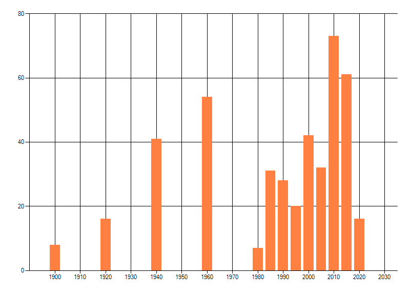 Het aantal atlasblokken (5x5 km) waarin de soort is gemeld binnen een periode van vijf jaar (vanaf 1980) of twintig jaar. Niet gecorrigeerd voor waarnemersinspanning en het aantal doorgegeven waarnemingen kan sterk variëren per periode, dus een trend in verspreiding kan hier niet direct uit worden afgelezen. Het opgegeven jaartal is het eerste jaar van de periode. Bron: gevalideerde waarnemingen uit de NDFF.