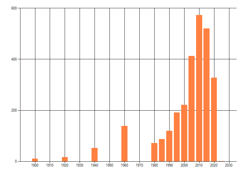 Het aantal atlasblokken (5x5 km) waarin de soort is gemeld binnen een periode van vijf jaar (vanaf 1980) of twintig jaar. Niet gecorrigeerd voor waarnemersinspanning en het aantal doorgegeven waarnemingen kan sterk variëren per periode, dus een trend in verspreiding kan hier niet direct uit worden afgelezen. Het opgegeven jaartal is het eerste jaar van de periode. Bron: gevalideerde waarnemingen uit de NDFF.