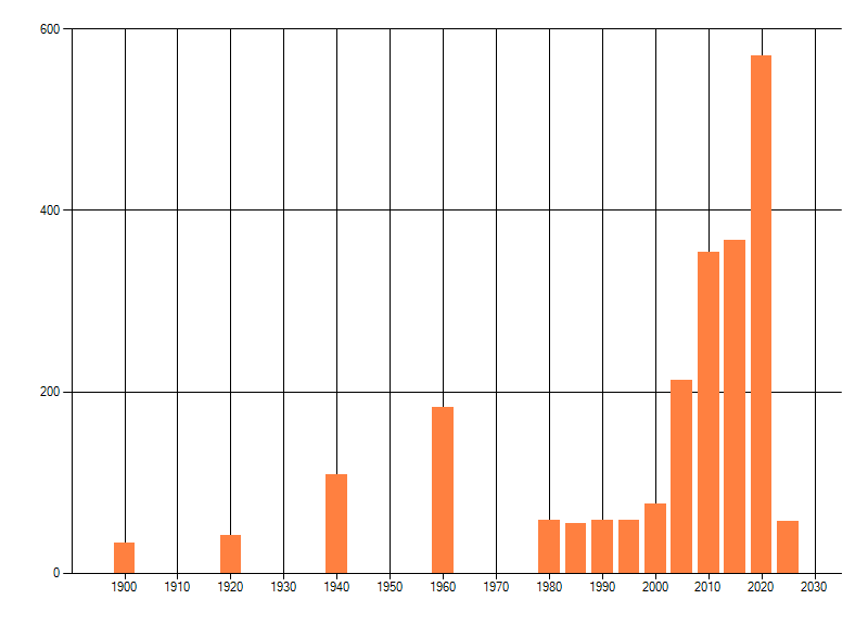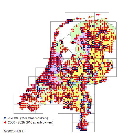Het aantal atlasblokken (5x5 km) waarin de soort is gemeld binnen een periode van vijf jaar (vanaf 1980) of twintig jaar. Niet gecorrigeerd voor waarnemersinspanning en het aantal doorgegeven waarnemingen kan sterk variëren per periode, dus een trend in verspreiding kan hier niet direct uit worden afgelezen. Het opgegeven jaartal is het eerste jaar van de periode. Bron: gevalideerde waarnemingen uit de NDFF.