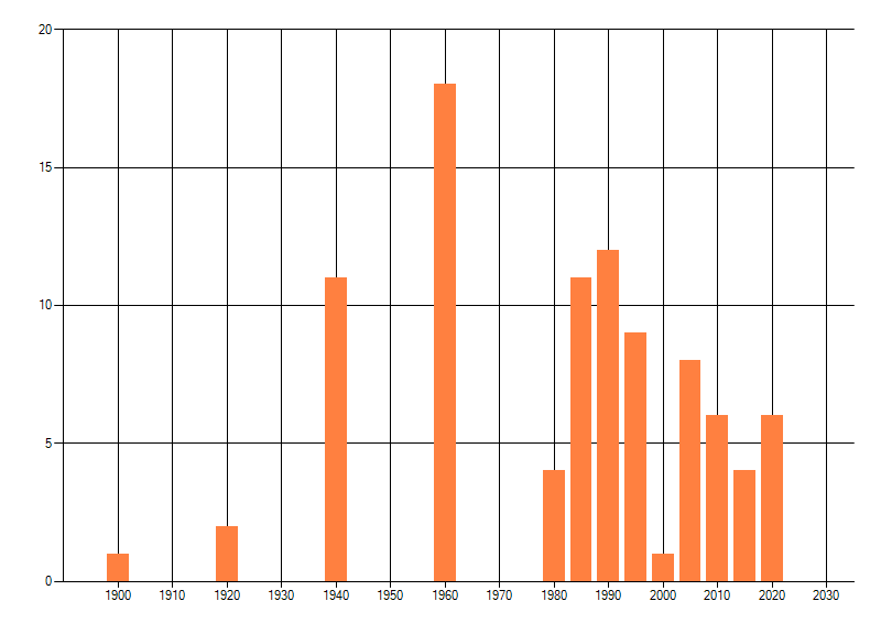 Het aantal atlasblokken (5x5 km) waarin de soort is gemeld binnen een periode van vijf jaar (vanaf 1980) of twintig jaar. Niet gecorrigeerd voor waarnemersinspanning en het aantal doorgegeven waarnemingen kan sterk variëren per periode, dus een trend in verspreiding kan hier niet direct uit worden afgelezen. Het opgegeven jaartal is het eerste jaar van de periode. Bron: gevalideerde waarnemingen uit de NDFF.